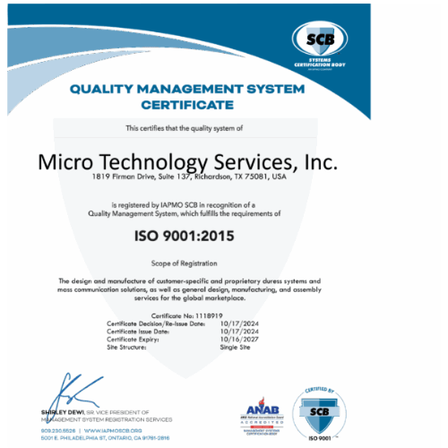 At MTSI, our commitment to delivering exceptional technology solutions is firmly rooted in our adherence to ISO 9001:2015 standards. This internationally recognized quality management system ensures that we consistently meet and exceed customer expectations through rigorous processes and continuous improvement. By adhering to these standards, we establish a robust framework for quality control, which enhances our ability to deliver reliable and high-performance products that meet the highest industry benchmarks.